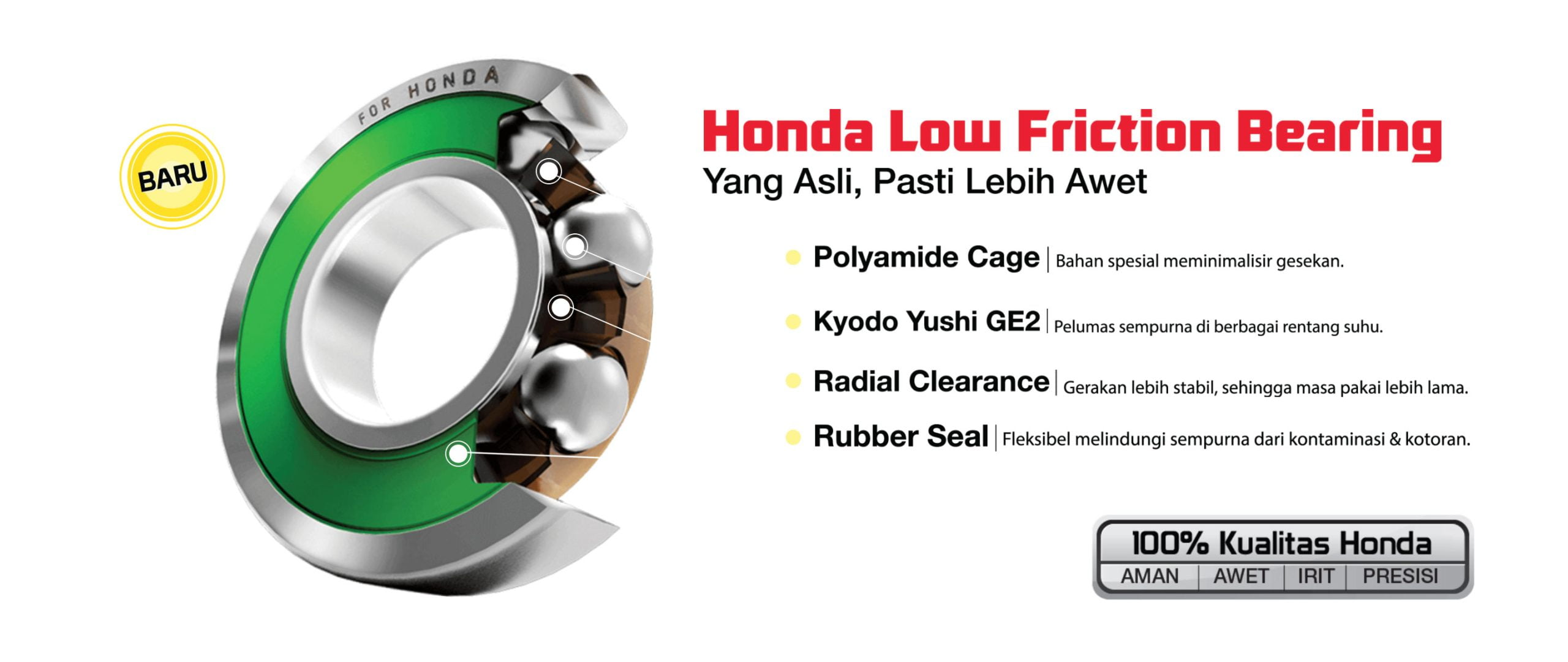 Melakukan pemerikaan rutin terhadap bearing setiap kelipatan 4.000km. Hindari kontaminasi debu dan kotoran pada saat pemasangan bearing. Segera ganti bearing apabila bearing pernah terendam air atau jika terdengar suara abnormal. Dan juga apabila bearing yang pernah lepas dari dudukannya. Gunakan gemuk yang sesuai serta hindari pemberian gemuk secara berlebihan, karena akan membuat debu/serbuk logam melekat pada bearing.